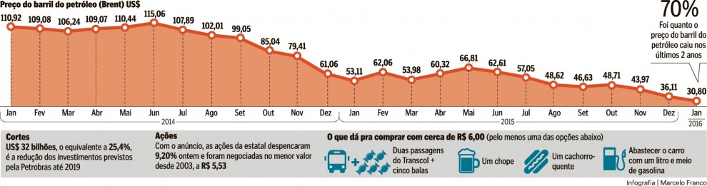 A revisão no Plano de Negócios também projetou novas cotações do petróleo tipo Brent – referência para o mercado global. A previsão passou de US$ 55 para US$ 45 o barril. No ano passado, o preço médio do Brent ficou em US$ 52 o barril. Ontem, ele fechou na casa dos 30 dólares.