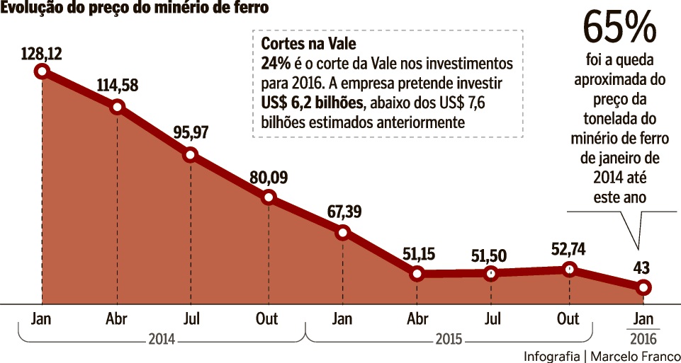 A Vale, por exemplo, anunciou no final de 2015 cortes de 24% para este ano. A empresa pretendia investir US$ 7,6 bilhões, mas baixou a cifra para US$ 6,2 bilhões. Considerando o médio prazo os cortes são ainda mais significativos: de 48,7%, entre 2015 e 2020.